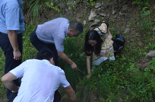 扶贫小组会同村支书、村长以及驻村扶贫干部上山实地考察取样。经过七个小时的跋山涉水,专家组翻越了两座大山,发现当地野生中草药资源非常丰富,并对原金马村现有中草药材资源的土壤进行取样,以便进一步分析土壤具体成分和适宜栽种的植物。因金石村所辖地域非常辽阔,专家组按照合乡并村前的金马村、尖石村的区域进行了走访采样,工作量非常巨大,任务非常繁重。