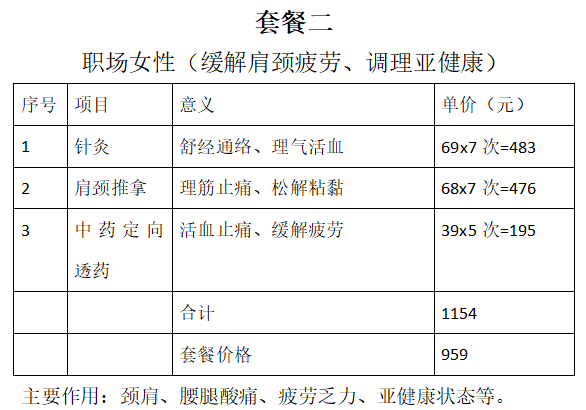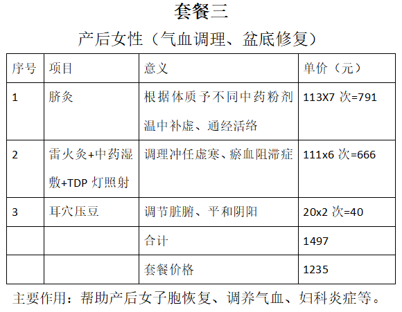 通用优惠:所有中医妇科理疗项目(针灸、中药熏蒸、穴位贴敷)活动期间八折,消费满1000元赠送养生锤、足浴包、暖宫贴三选一。