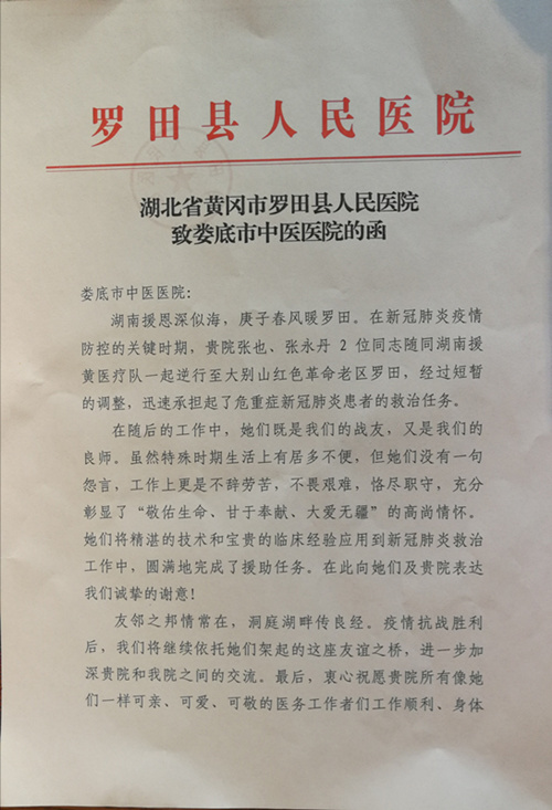 湖北省黄冈市罗田县人民医院致娄底市中医医院的函