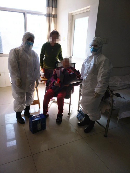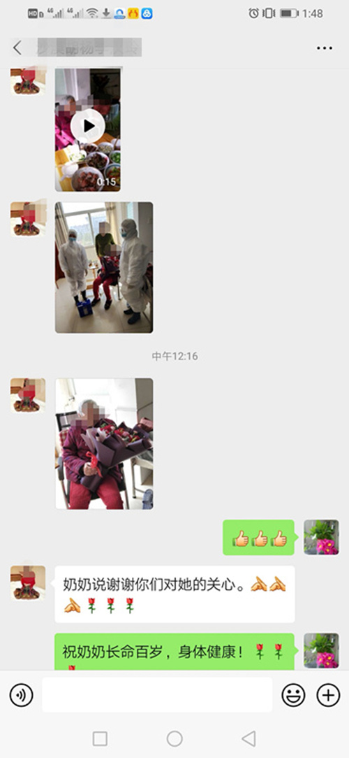 “祝您生日快乐,祝您生日快乐……”,2月17日在娄底市中医医院二病室响起了生日快乐歌,这天是老病友赵奶奶九十岁大寿。每年赵奶奶生日,二病室主任王双娥、护士长李育红都会早早预定好鲜花和蛋糕,准时为老人家送上美好的生日祝福。但由于王主任和李护士长还处于隔离期和赵奶奶分隔两地,她们特意千叮咛万嘱咐,请科室同事代为转达。当天上午医护人员穿着厚厚的防护服如期将鲜花和礼物送到了赵奶奶手中,并通过微信视频联系上王主任和李护士长,为她送上了特殊的“云祝福”。