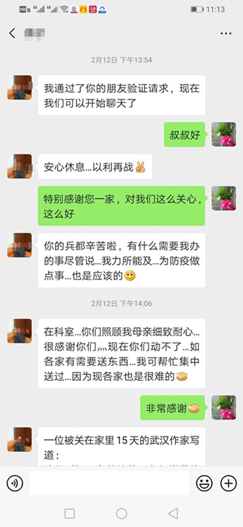 “在科室,你们照顾我母亲细致耐心,很感谢你们!现在你们动不了,如各家需要送物资,我可帮忙集中送过去。为防疫做点力所能及的事,也是应该的。”“奶奶说谢谢你们对她的关心”赵奶奶儿子和女儿分别发来微信给李育红,对王主任和她及娄底市中医医院所有的医护人表示感谢,言语朴实却饱含着动人的情义。