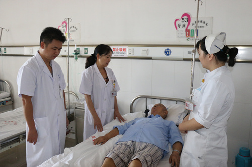 4月26日下午,在内二科的病房里,82岁的敬大爷紧紧握住王双娥主任的手,嘴里念念有词:“握住主任的手不松,心里就好像吃了甜酒一样甜。”此话一出,王双娥主任总笑得合不拢嘴。这是敬大爷在内二科住院的第6天,每次只要王双娥主任去查房,总要向她“表白”。