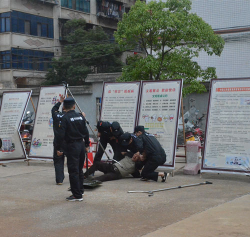 演练于下午16时正式开始。一名“歹徒”因有个人精神问题,携带管制刀具、汽油桶进入住院部大门,被值班保安发现,立即上前制止,因“歹徒”情绪激动,无法控制,值班保安立即上报医院监控中心值班人员,请求支援。值班人员立即按照反恐防爆处置流程,迅速启动医院反恐应急预案,指挥院内其余安保人员立即赶到现场展开行动,并建立警戒范围,同时疏散周边病人和医务人员,与“歹徒”周旋。安保队员们手持防爆器材,找准时机,迅速出击,一举制服了“歹徒”,及时控制了事发现场,并将肇事“歹徒”移送派出所。看着安保人员敏捷的身手,围观群众热烈的鼓掌叫好。接下来,安保队员还展示了盾牌操和围攻战术。