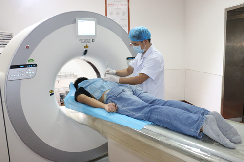 7月21日下午,在内二科主任王双娥的支持下,在李育红护士长的默契配合下,邓子易在胡老的右侧背部铺好定位纸,通过CT扫描需要穿侧的位置点,随即开展消毒、麻醉、进导引针、进穿刺针……一系列手术动作规范、熟练,分6次钳取了6条病理组织用于送细胞学及病理检查。